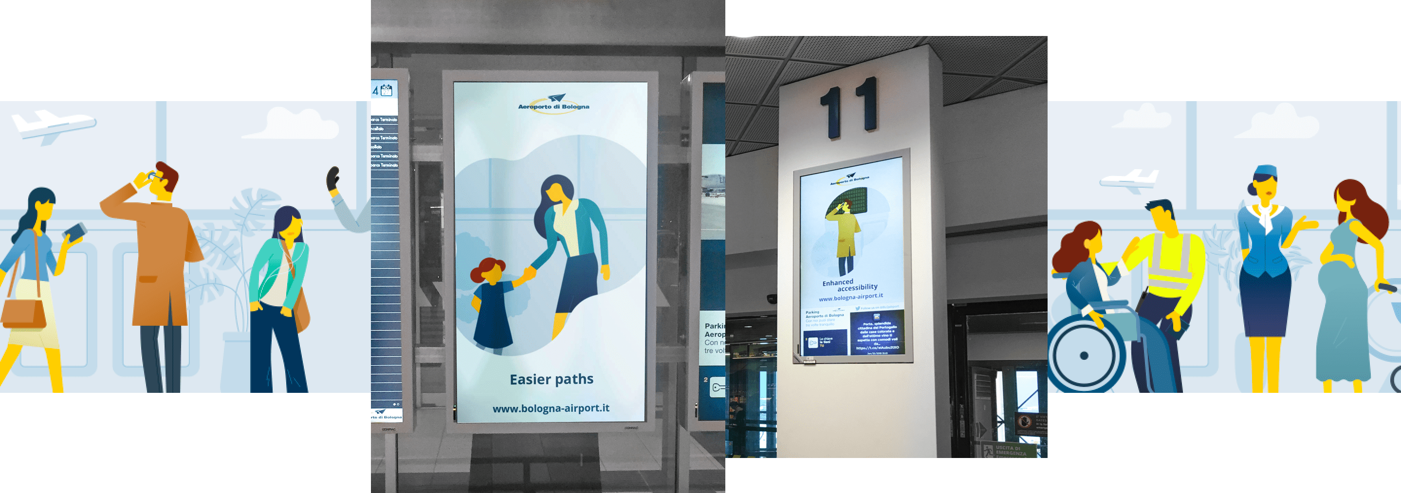 Il focus della campagna di comunicazione è stato rivolto ai passeggeri, protagonisti indiscussi dell’ambiente aeroportuale. Ci siamo occupati di dare forma a veri e propri scenari di vita reale, attraverso illustrazioni e brevi clip animate, così abbiamo raccontato come il nuovo sito potrà aiutare: famiglie, ipovedenti, passeggeri in viaggio per lavoro o per svago e giovani travelers prima e dopo il loro viaggio.