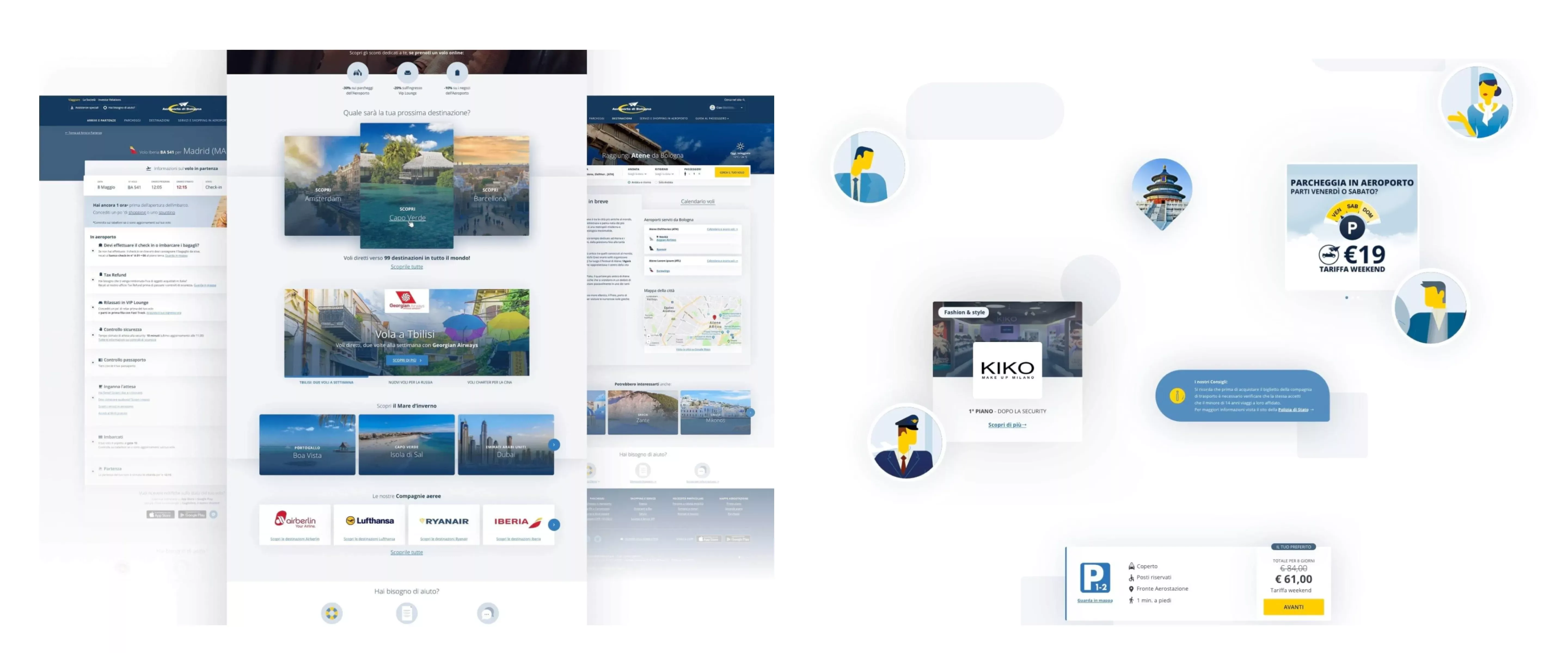 In parallelo ha preso il via la progettazione evolutiva dell’App di Aeroporto di Bologna in collaborazione con il partner tecnologico Mavigex. Durante questi mesi ci stiamo occupando di progettare nuove funzionalità e logiche di servizi tra Sito web e App, allineare tutta l’interfaccia iOS e Android alla nuova identità visiva dell’Aeroporto e pianificare le prossime roadmap di rilasci app che dal prossimo anno daranno forma al lavoro fatto insieme ai team partner.
