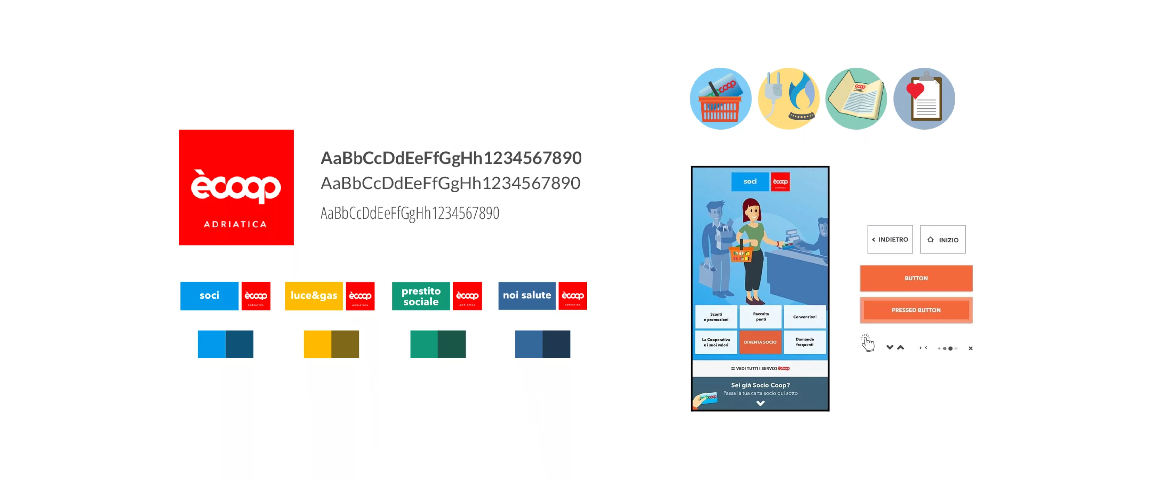 Per il progetto, totalmente nuovo per Coop Adriatica, e in generale per Coop, è stata scelta la strada di creare un’identità nuova e parallela al marchio Coop. Kitchen ha lavorato al naming e alla brand identity, ideando il nuovo marchio ècoop e quelli dei quattro servizi, definendo così anche lo schema di colori. Insieme a Kitchen abbiamo definito l’impianto tipografico di ècoop, affinché fosse coerente tra touchpoint offline e online. A partire da queste linee guida di brand, il nostro team ha sviluppato tutta l’identità visiva del prodotto digitale ècoop.