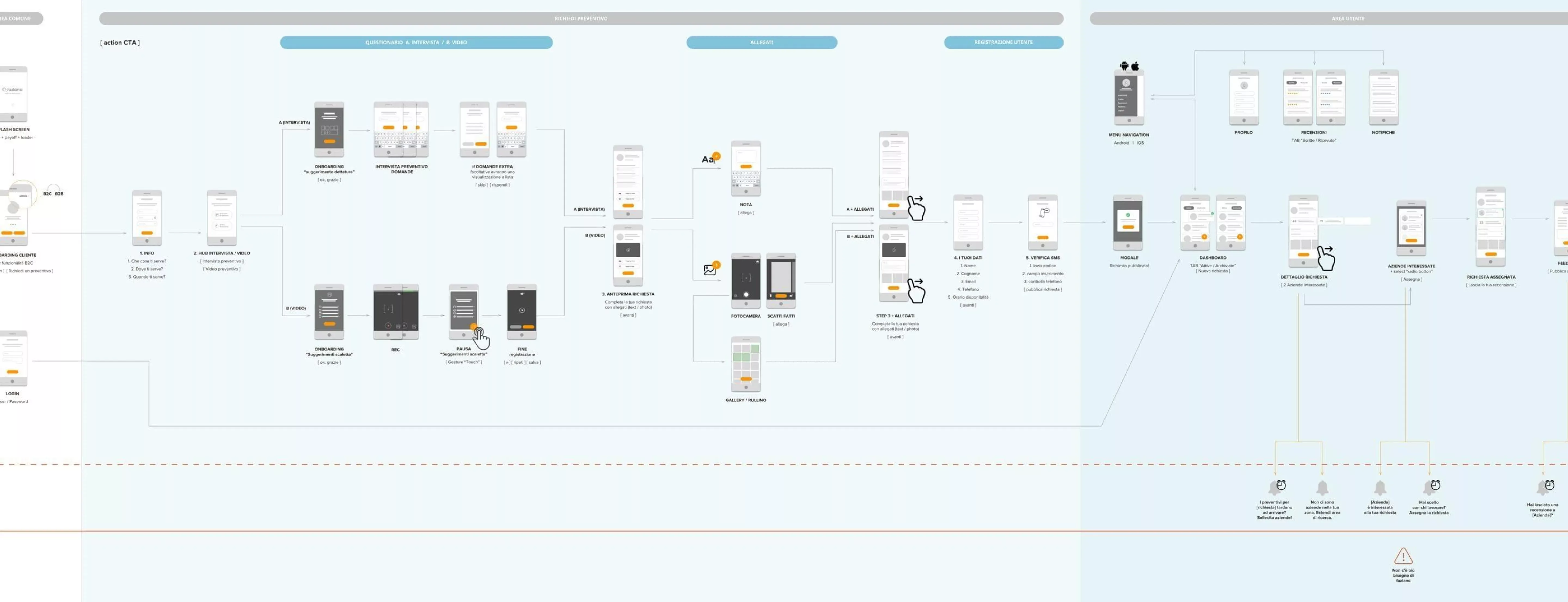 Una volta messa in produzione la prima milestone, abbiamo fatto una sessione di interviste e test con gli utenti, sia per validare le scelte fatte e quanto rilasciato, sia per indagare più a fondo l’utilizzo nel tempo del servizio e ricavare insight di valore per avviare il redesign della parte più importante di Fazland: l’area riservata di utenti e professionisti, il cuore dove avviene la relazione tra chi cerca e chi offre.