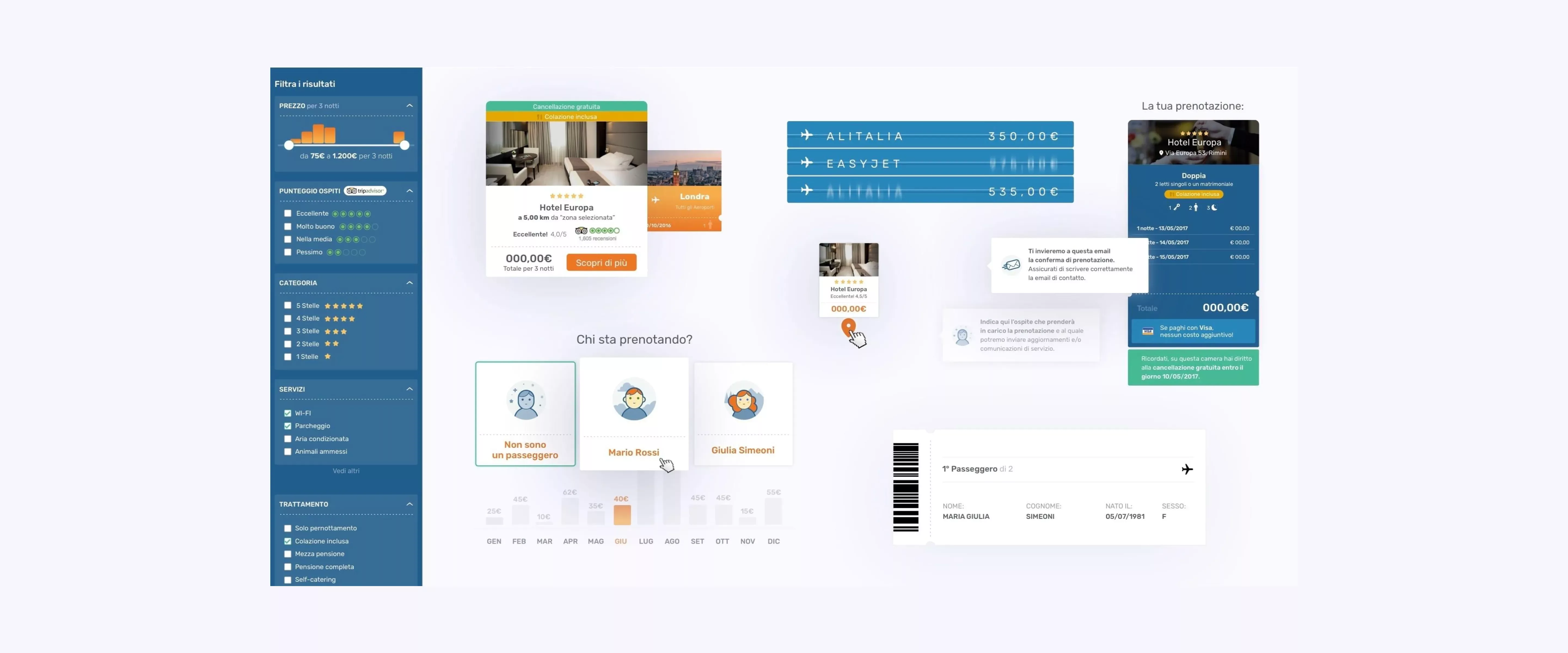 Abbiamo studiato ogni dettaglio dell’interfaccia, ogni momento di utilizzo, ogni segmento di prodotto scelto, per favorire una consistenza visiva e un’impronta distintiva del brand in ogni fase dell’acquisto, dalla semplice ispirazione per la prossima meta vacanze fino alla conferma della prenotazione conclusa.