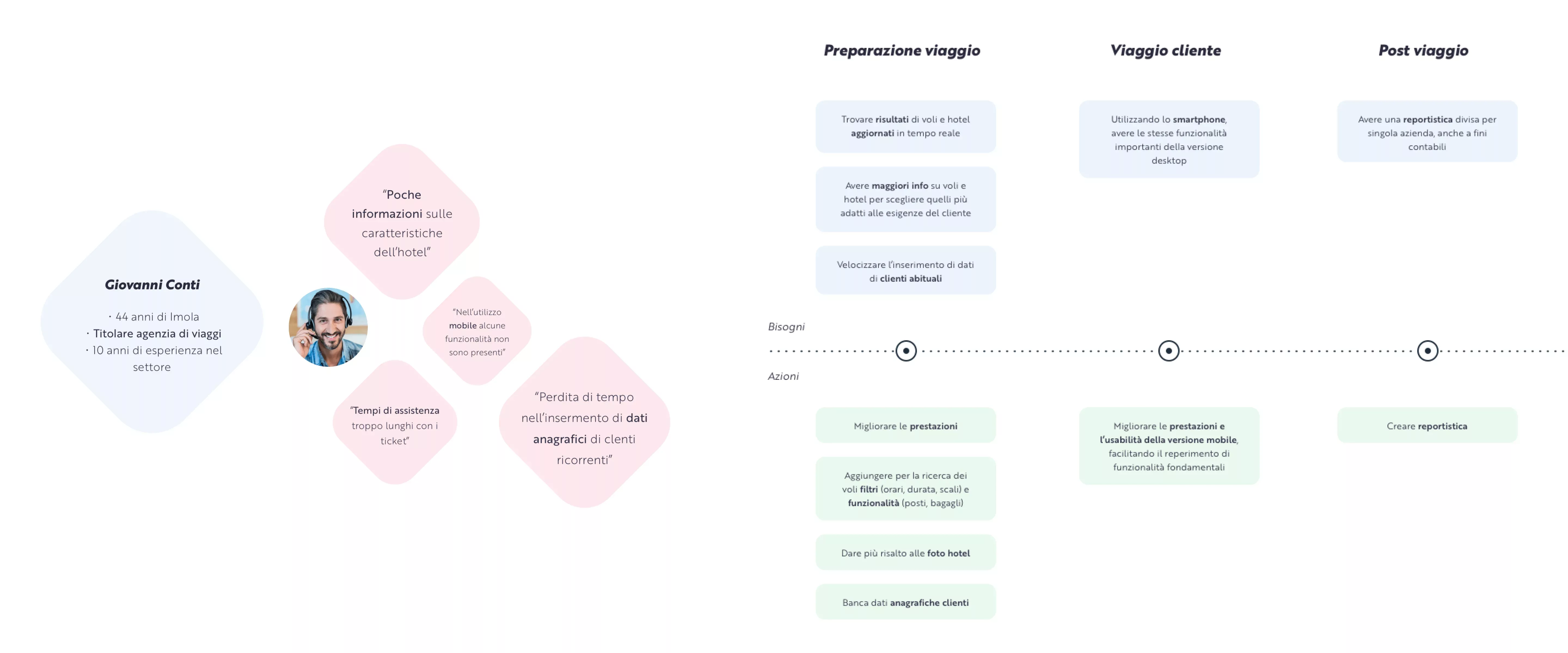 Abbiamo quindi intervistato 8 agenti di viaggio in altrettante sessioni esplorative, nelle quali abbiamo approfondito contestualmente il loro utilizzo della piattaforma, facendo emergere criticità, opportunità e desiderata.