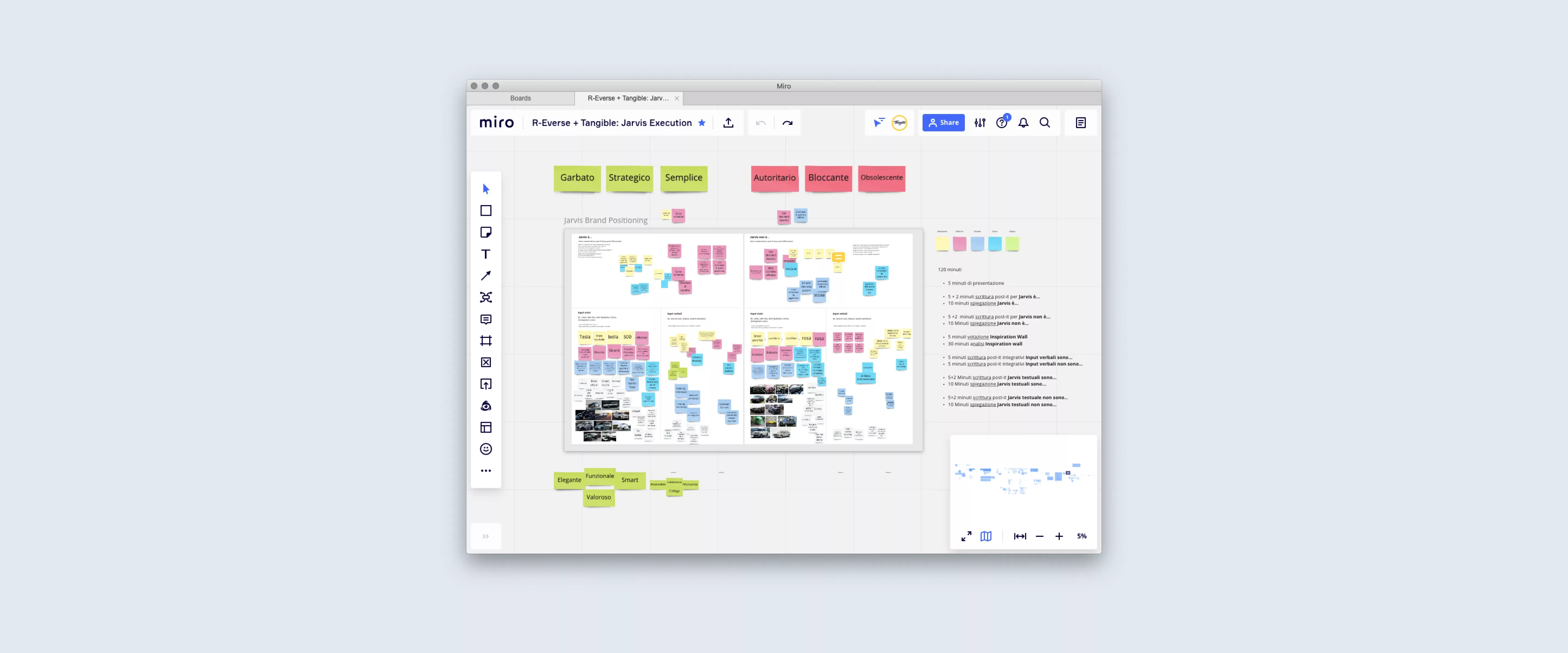 La nostra priorità era definire una metodologia utile a distillare tanti ragionamenti espressi in astratto per arrivare ad una convergenza ed assiomi utili alla definizione comunicativa del prodotto. Abbiamo organizzato un workshop con il cliente in cui si è riusciti a delineare con molta precisione quali fossero i valori e i principi fondativi del tipo di strumento che si stava creando, lo stile, il tono di voce e - non meno importante - evidenziare cosa il nuovo tool non doveva essere.